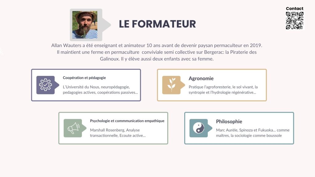 Allan Wauters a été 10 ans enseignant et animateur avant de devenir paysan permaculteur en 2019. Il maintient une ferme sur Bergerac: la Piraterie des Galinoux. Il y intègre les enseignement de recherches variées en coopération, en agronomie régénérative et autre pratiques symbiotiques. Il aura à coeur d’augmenter votre puissance d’agir et vos capacités à vivre agréablement vos projets.